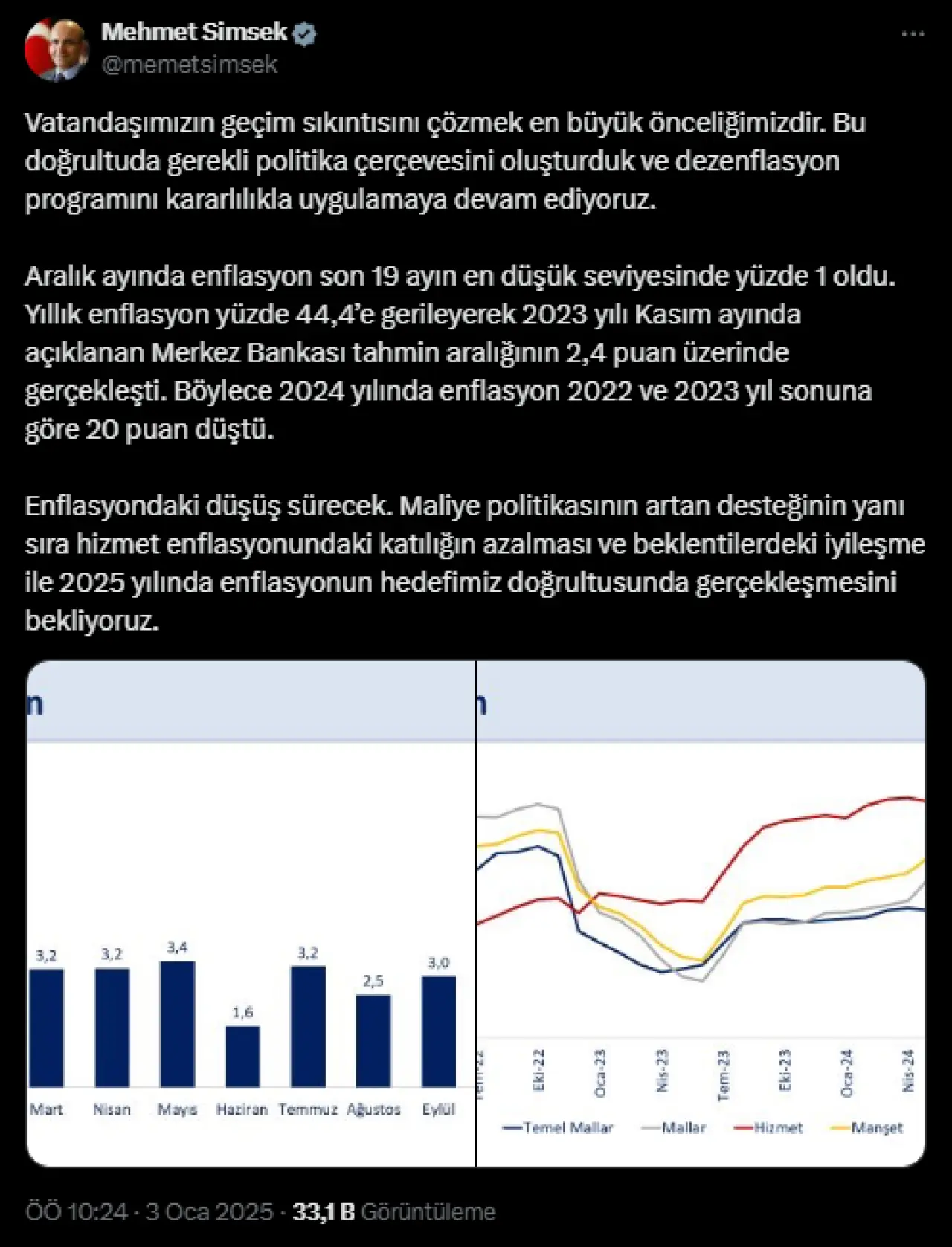 Hazine ve Maliye Bakanı Mehmet Şimşek, Sosyal medya hesabından enflasyon sonuçlarını değerlendirerek, vatandaşların geçim sıkıntısını çözmeyi en büyük öncelikleri olarak belirlediklerini belirtti. Şimşek, gerekli politika çerçevesini oluşturduklarını ve dezenflasyon programını kararlılıkla uygulamaya devam ettiklerini ifade etti.