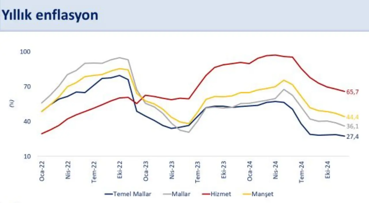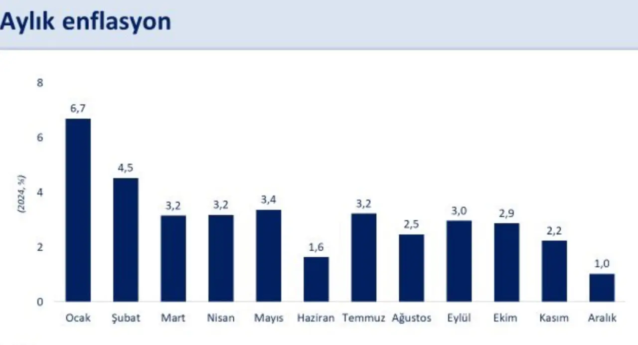 Aralık ayında enflasyon, son 19 ayın en düşük seviyesi olan yüzde 1 olarak gerçekleşti. Yıllık enflasyon ise yüzde 44,4'e gerileyerek, Merkez Bankası tahmin aralığının 2,4 puan üzerinde oldu. 2024 yılında enflasyon, 2022 ve 2023 yıl sonlarına göre 20 puan azaldı.