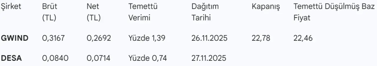 GWIND 26.11.2025 tarihinde hisse başına brüt 0,3167 TL, net 0,2692 TL temettü dağıtacak. Bu, kapanış fiyatına göre yüzde 1,39 temettü verimine denk geliyor.