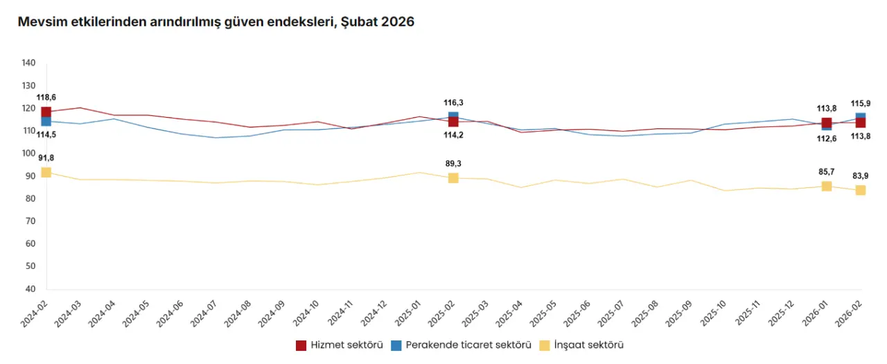 Türkiye İstatistik Kurumu (TÜİK), 2026 yılı Şubat ayına ilişkin mevsim etkilerinden arındırılmış Hizmet, Perakende Ticaret ve İnşaat Güven Endeksleri verilerini paylaştı. Şubat ayında sektörlerin güven endekslerinde farklı seyirler izlendi; perakende ticaret sektörü ivme kazanırken, inşaat sektöründe düşüş kaydedildi. Hizmet sektöründe ise endeks değerinde bir değişim yaşanmadı.