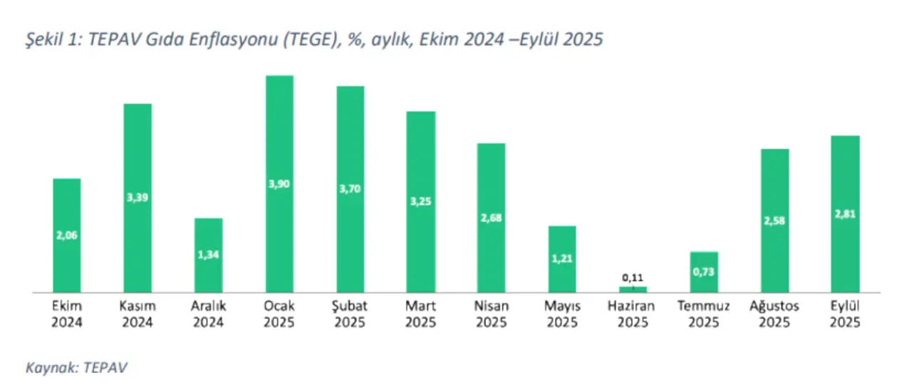 Türkiye Ekonomi Politikaları Araştırma Vakfı (TEPAV) tarafından açıklanan Gıda Fiyat Endeksi (TEGE) verilerine göre gıda enflasyonundaki yükseliş eğilimi Eylül 2025 döneminde de sürdü. 1-30 Eylül 2025 tarihleri arasında aylık gıda enflasyonu yüzde 2,81 oranında artış gösterdi. Böylece, gıda fiyatlarındaki aylık artış, son aylarda olduğu gibi kritik yüzde 2 seviyesinin üzerinde gerçekleşmiş oldu.