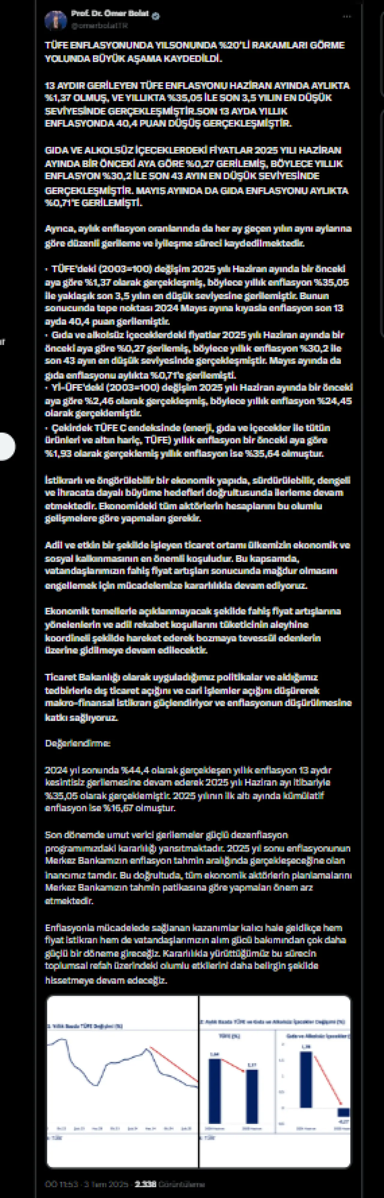 Ticaret Bakanı Ömer Bolat, sosyal medya hesabından Haziran ayı enflasyon verileri ile ilgili değerlendirmede bulundu. Bakan Bolat, TÜFE enflasyonunda yılsonunda %20’li rakamları görme yolunda büyük aşama kaydedildiğini belirtti. Haziran ayında aylık %1,37 olan TÜFE enflasyonunun yıllık bazda %35,05 ile son 3,5 yılın en düşük seviyesine gerilediğini açıkladı.