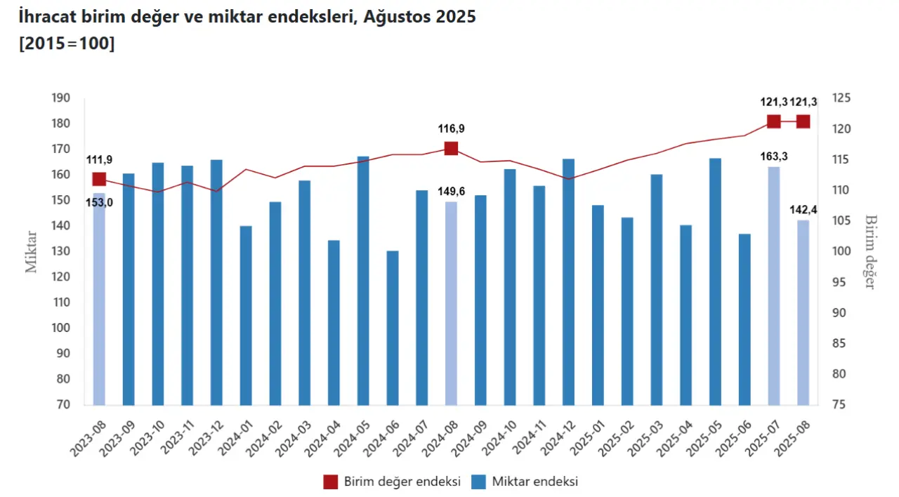 Türkiye'nin Ağustos 2025 dönemine ilişkin dış ticaret endeksleri TÜİK tarafından açıklandı. Verilere göre Türkiye'nin ihracatı bir önceki yılın aynı ayına göre değer olarak artış gösterirken miktar bazında daralma yaşadı. İhracat ürünlerinin fiyatlarını gösteren birim değer endeksi yüzde 3,8 artarken satılan mal miktarını gösteren endeks ise yüzde 4,8 oranında geriledi.