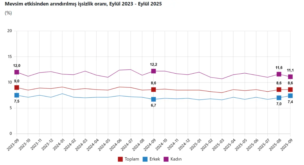 Bu veriler, Eylül 2025 döneminde işsizlik oranının sayısal olarak sabit kalmasına rağmen, istihdamdaki gerileme ve kadın-genç işsizliğindeki yüksek seyrin işgücü piyasasının kırılganlığını sürdürdüğünü gösteriyor.