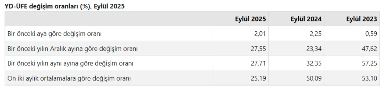 Eylül 2025 verilerine göre YD-ÜFE, bir önceki yılın aynı ayına göre yüzde 27,71 artış kaydetti. Aylık bazda değişim oranı ise yüzde 2,01 artış olarak gerçekleşti. Endeks, bir önceki yılın Aralık ayına göre yüzde 27,55, on iki aylık ortalamalara göre ise yüzde 25,19 artış gösterdi.