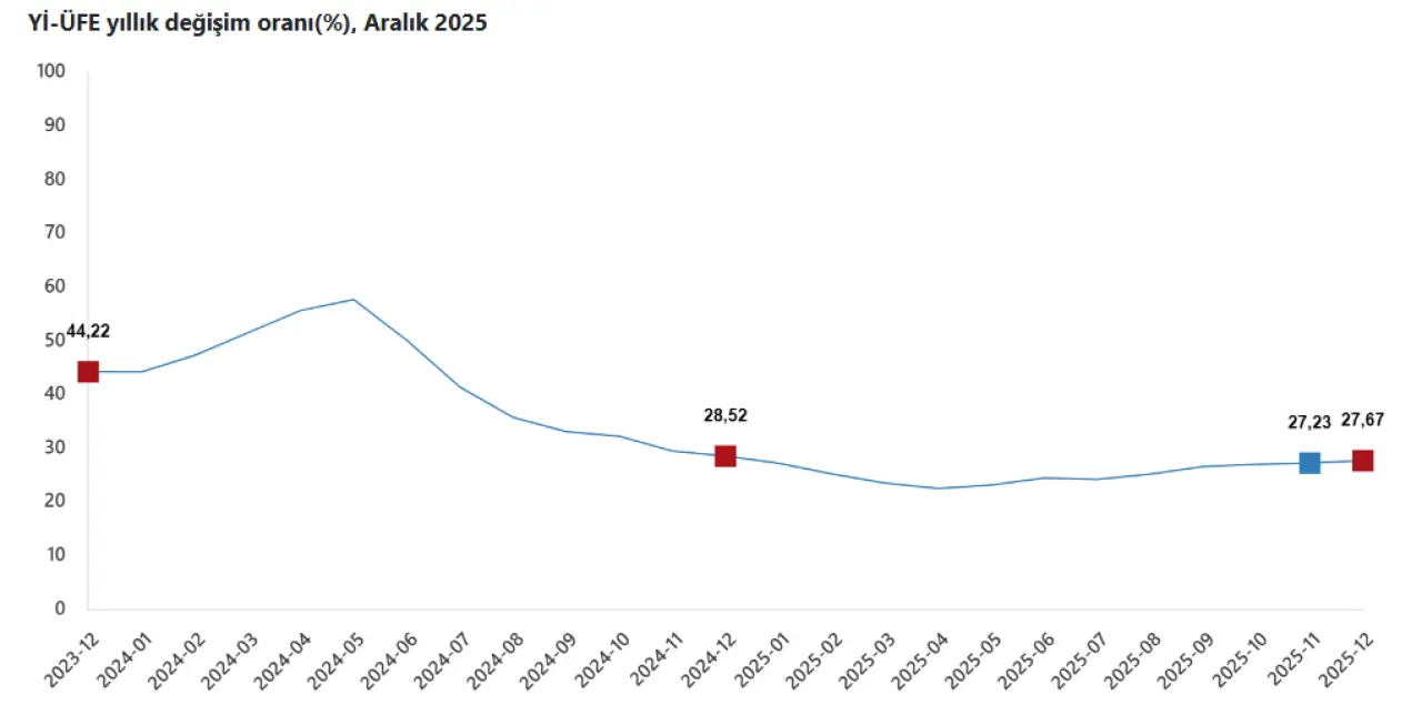 Geçmiş yılların verileriyle kıyaslandığında; 2024 yılı Aralık ayında yıllık artış yüzde 28,52, 2023 yılında ise yüzde 44,22 seviyesindeydi. Bu rakamlar, üretici enflasyonundaki yıllık artış hızının önceki yıllara göre daha düşük bir patikada olduğunu gösteriyor.