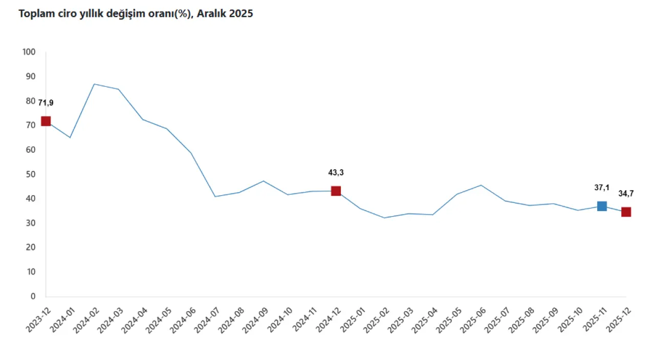 TÜİK verilerine göre, Türkiye ekonomisinin temel direklerini oluşturan ana sektörlerde ciro artış hızı ivme kaybetti. 2025 yılı Kasım ayında yıllık yüzde 37,3 olarak gerçekleşen ciro endeksi artışı, Aralık ayında yüzde 34,7 seviyesine geriledi.