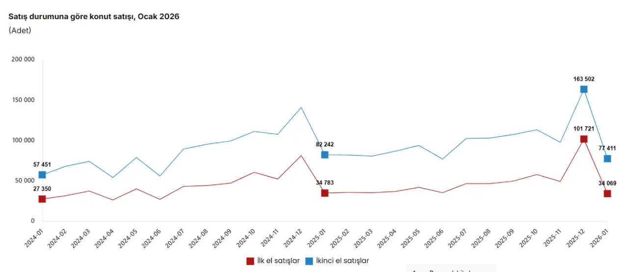 Ocak ayında ilk el konut satışları, geçen yılın aynı dönemine göre yüzde 2,1 oranında azalışla 34 bin 69 oldu. İkinci el konut satışları ise yüzde 5,9’luk bir gerileme ile 77 bin 411 olarak kayıtlara geçti. Toplam satışlar içinde ilk el konutların payı yüzde 30,6, ikinci el konutların payı ise yüzde 69,4 oldu.