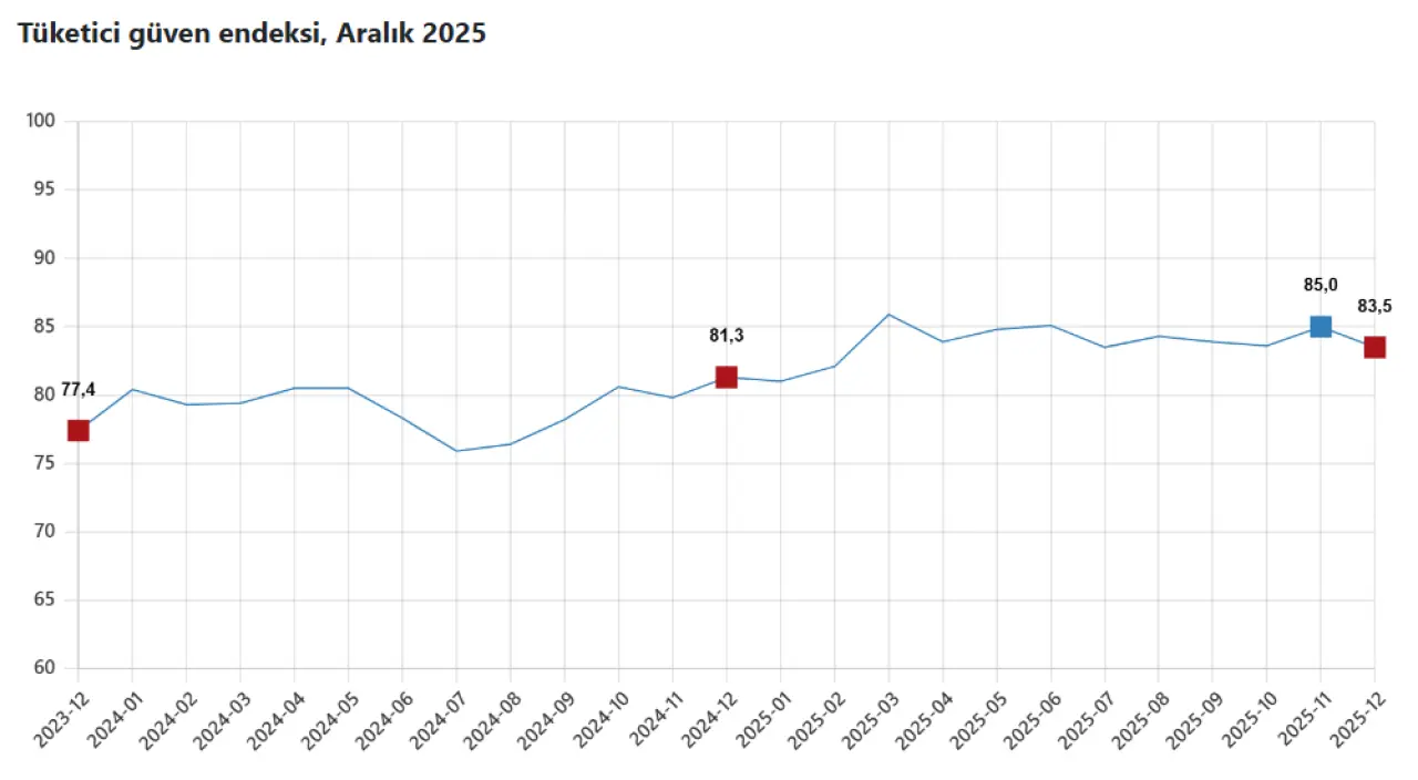 Türkiye İstatistik Kurumu (TÜİK) ve Türkiye Cumhuriyet Merkez Bankası iş birliğiyle hazırlanan Aralık 2025 Tüketici Güven Endeksi verileri açıklandı. Kasım ayında 85,0 olan endeks, Aralık ayında yüzde 1,8 oranında azalarak 83,5 değerini aldı.