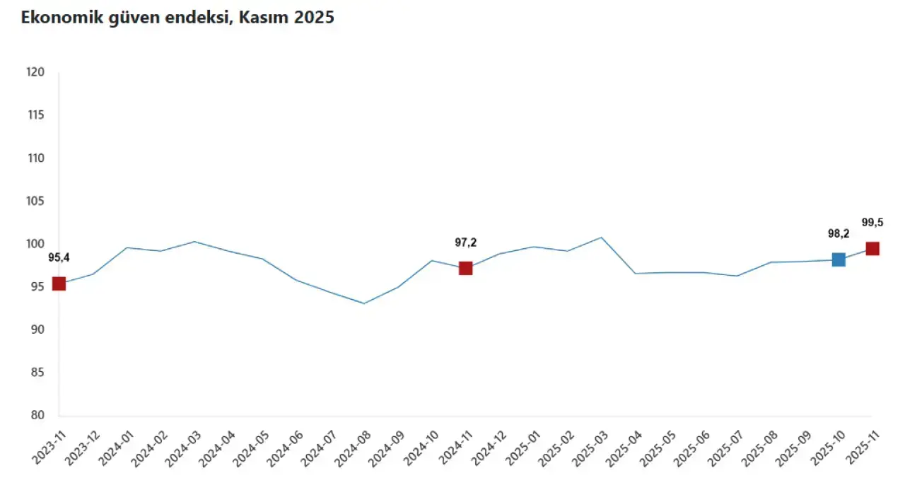 Türkiye İstatistik Kurumu (TÜİK) tarafından açıklanan Ekonomik Güven Endeksi (EGE), Kasım 2025 döneminde bir önceki aya göre yüzde 1,3 oranında artarak 99,5 değerini aldı. Ekim ayında 98,2 seviyesinde bulunan endeksin yükselişi, ekonomi aktörlerinin geleceğe yönelik beklentilerindeki olumlu sinyalleri güçlendirdi.