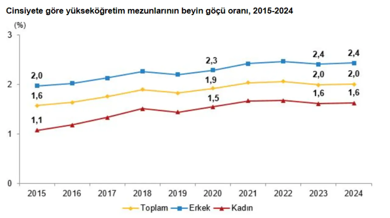 2024 yılında yükseköğretim mezunlarının beyin göçü oranı, bir önceki yıla göre değişmeyerek yüzde 2,0 olarak kayıtlara geçti. Cinsiyet bazında incelendiğinde ise kadınlarda beyin göçü oranı yüzde 1,6, erkeklerde ise yüzde 2,4 olarak belirlendi.