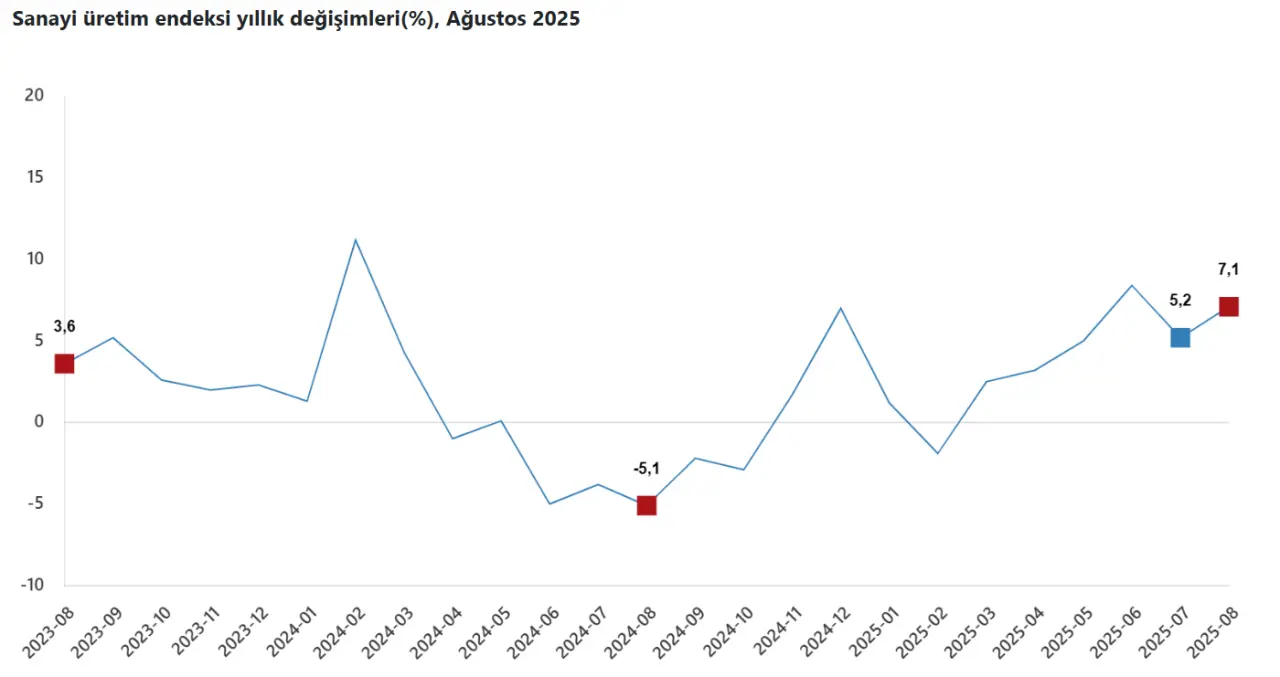 Türkiye İstatistik Kurumu (TÜİK) tarafından yayımlanan Ağustos 2025 Sanayi Üretim Endeksi verilerine göre, Türkiye sanayi üretimi güçlü seyrini sürdürerek bir önceki yılın aynı ayına göre yüzde 7,1 oranında arttı. Ancak aylık bazda artış yüzde 0,4 ile sınırlı kaldı.