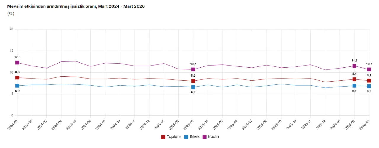 Hanehalkı İşgücü Araştırması sonuçlarına göre, 15 ve daha yukarı yaştaki kişilerde işsiz sayısı Mart ayında bir önceki aya göre 96 bin kişi azalarak 2 milyon 873 bin kişi olarak gerçekleşti. İşsizlik oranı erkeklerde yüzde 6,8 olarak tahmin edilirken, kadınlarda bu oran yüzde 10,7 oldu.