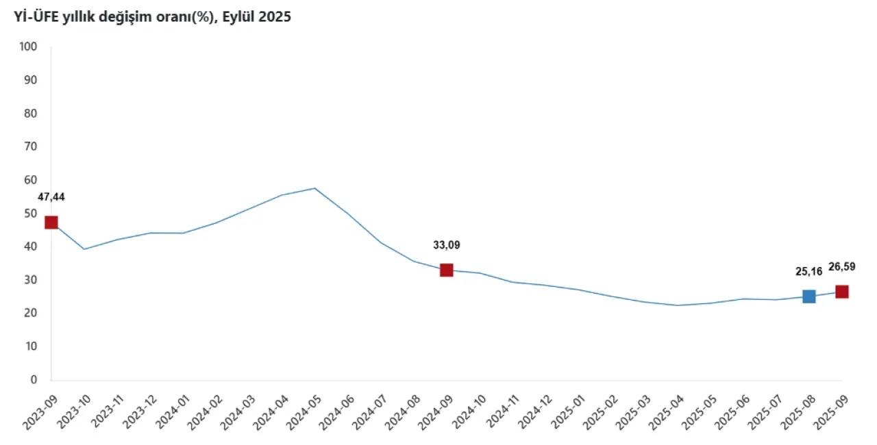 Türkiye İstatistik Kurumu (TÜİK) tarafından açıklanan Yurt İçi Üretici Fiyat Endeksi (Yİ-ÜFE), Eylül 2025 döneminde önemli bir artış kaydetti. Üretim maliyetlerindeki değişimleri gösteren Yİ-ÜFE, bir önceki yılın aynı ayına göre yıllık yüzde 26,59 artış gösterirken, bir önceki aya göre ise aylık yüzde 2,52 yükseldi.