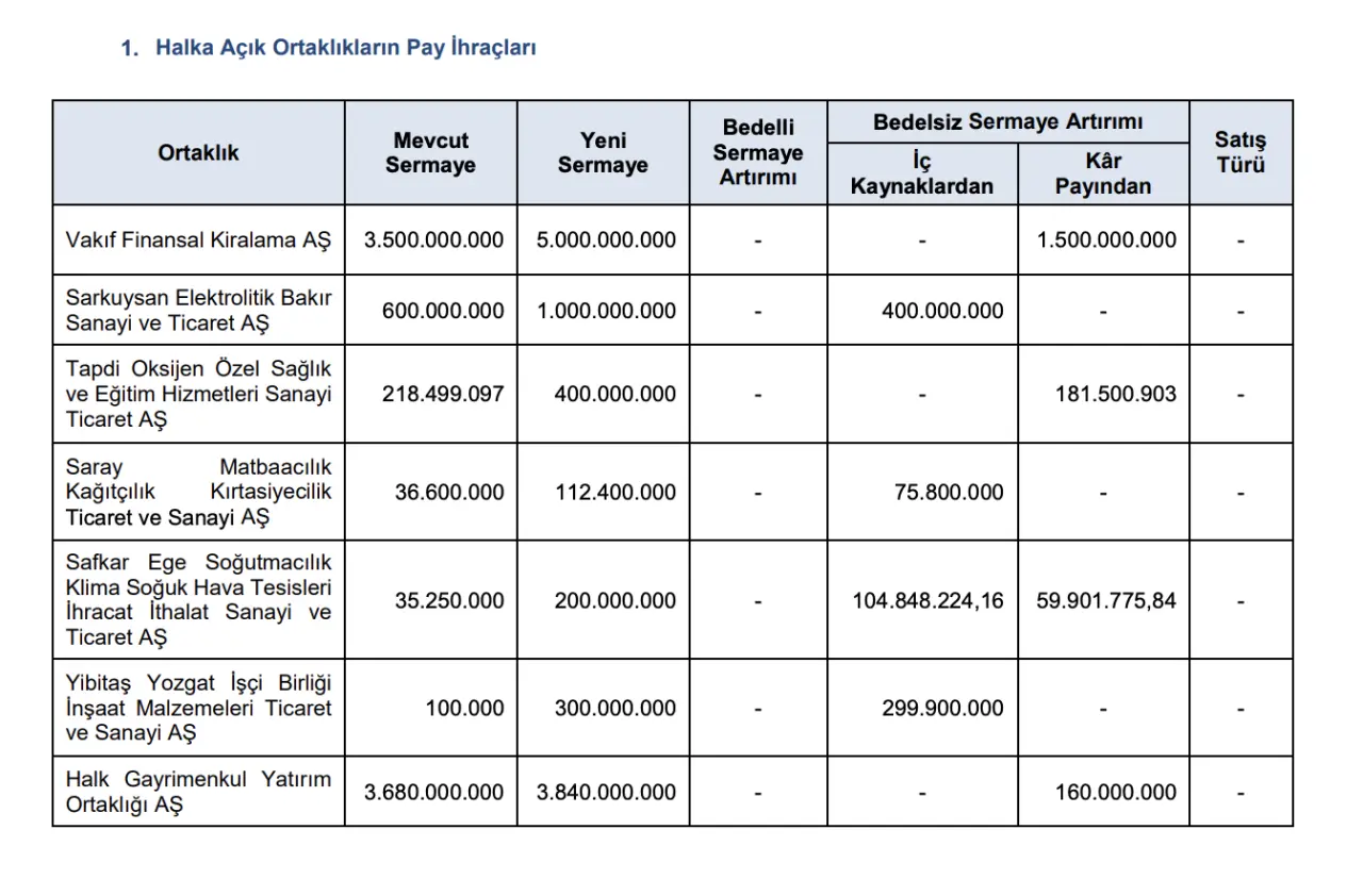 Borsa İstanbul’da işlem gören yedi farklı şirket, mevcut sermayelerini bedelsiz sermaye artırımı ile yükseltme kararı aldı. Yatırımcılar açısından cebinden para çıkmadan yeni hisse elde edilmesini sağlayan bu adımlar, şirketlerin özkaynak yapısını da güçlendirmeyi hedefliyor. Açıklanan tabloya göre artışların bir kısmı iç kaynaklardan, bir kısmı ise kâr paylarından karşılanacak.