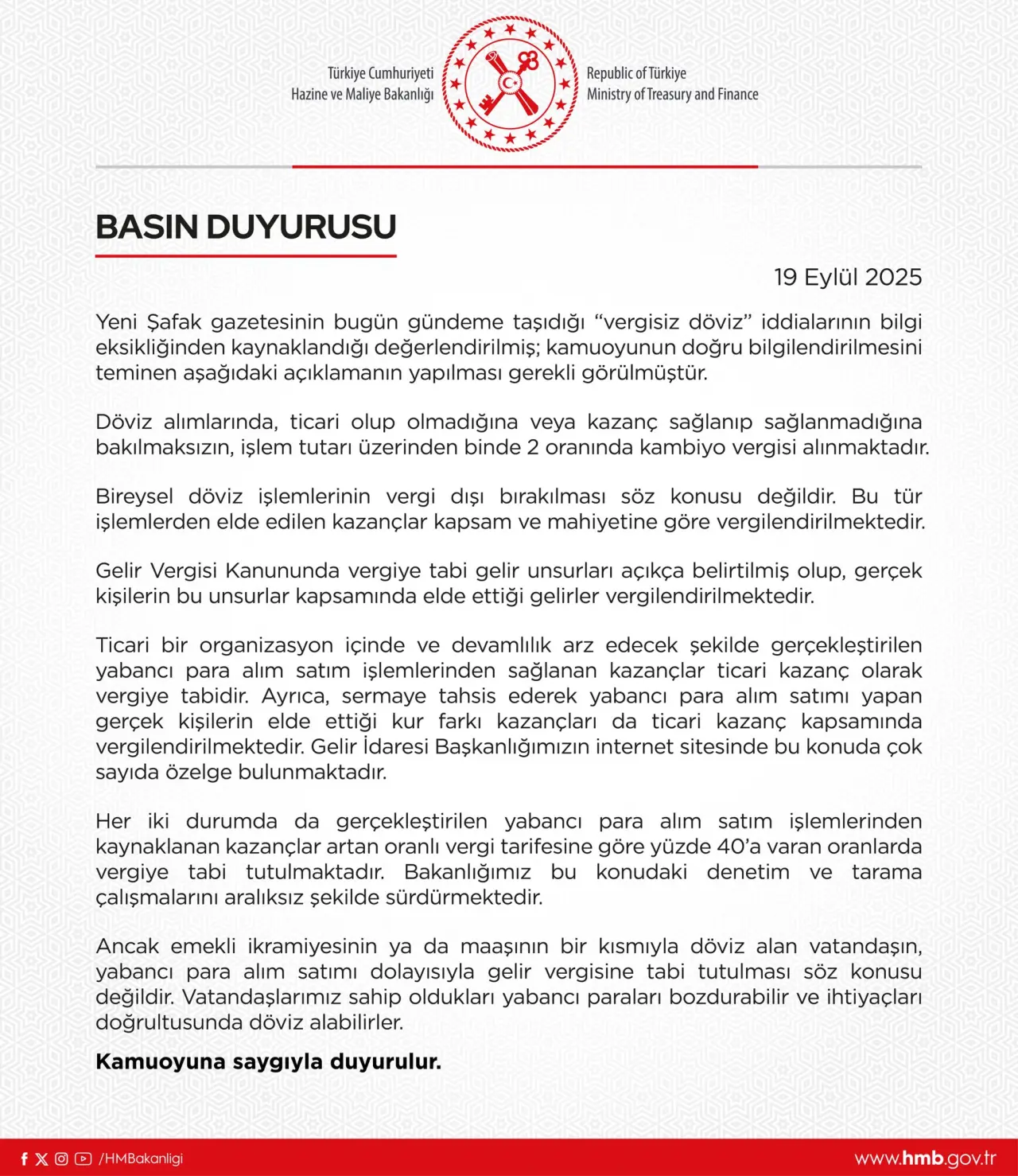 Türkiye Cumhuriyeti Hazine ve Maliye Bakanlığı, bazı basın organlarında yer alan “vergisiz döviz” iddialarına ilişkin yazılı bir açıklama yayımladı. Bakanlık, söz konusu haberlerin bilgi eksikliğinden kaynaklandığını belirterek kamuoyunu doğru bilgilendirmek amacıyla açıklama yapılmasının gerekli görüldüğünü bildirdi.