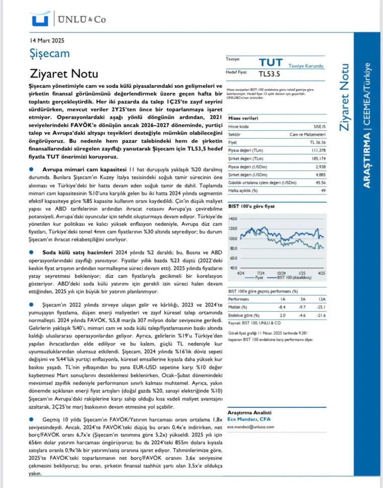 ÜNLÜ & Co, Şişecam yönetimiyle gerçekleştirilen toplantının ardından yayımladığı ziyaret notunda, şirketin kısa vadede zayıf seyreden talebe rağmen, 2026-2027 döneminde operasyonel toparlanmanın beklenebileceğini ifade etti. Hedef fiyat TL53.5 olarak belirlenirken, hisse için “TUT” tavsiyesi korundu.
