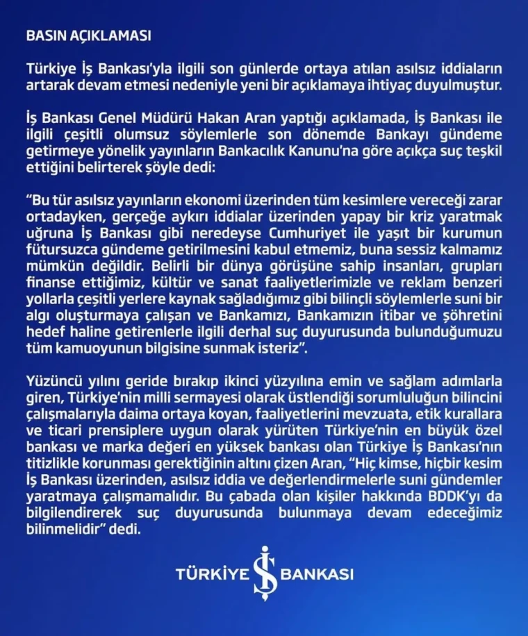 Bankanın, 100. yılına girerek ikinci yüzyılını başlatan Türkiye İş Bankası, milli sermaye sorumluluğuyla faaliyetlerini mevzuat ve etik kurallara uygun şekilde sürdürdüğünü vurgulayan Aran, “Hiçbir kesim, İş Bankası hakkında asılsız iddialarla gündem yaratma çabasında olmamalıdır. Bu tür girişimlere karşı, BDDK’yı da bilgilendirerek yasal sürecin takipçisi olacağımızı kamuoyuna duyururuz,” ifadelerini kullandı.