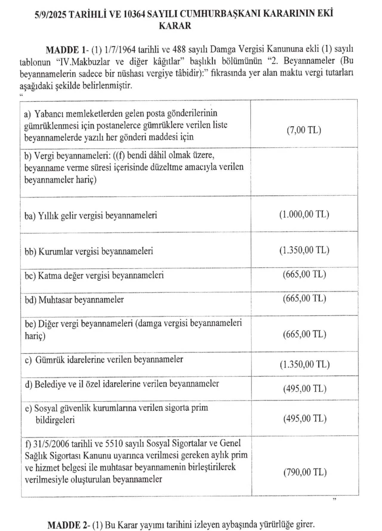 Yeni damga vergisi tutarları 1 Ekim 2025 tarihinden itibaren yürürlüğe girecek.