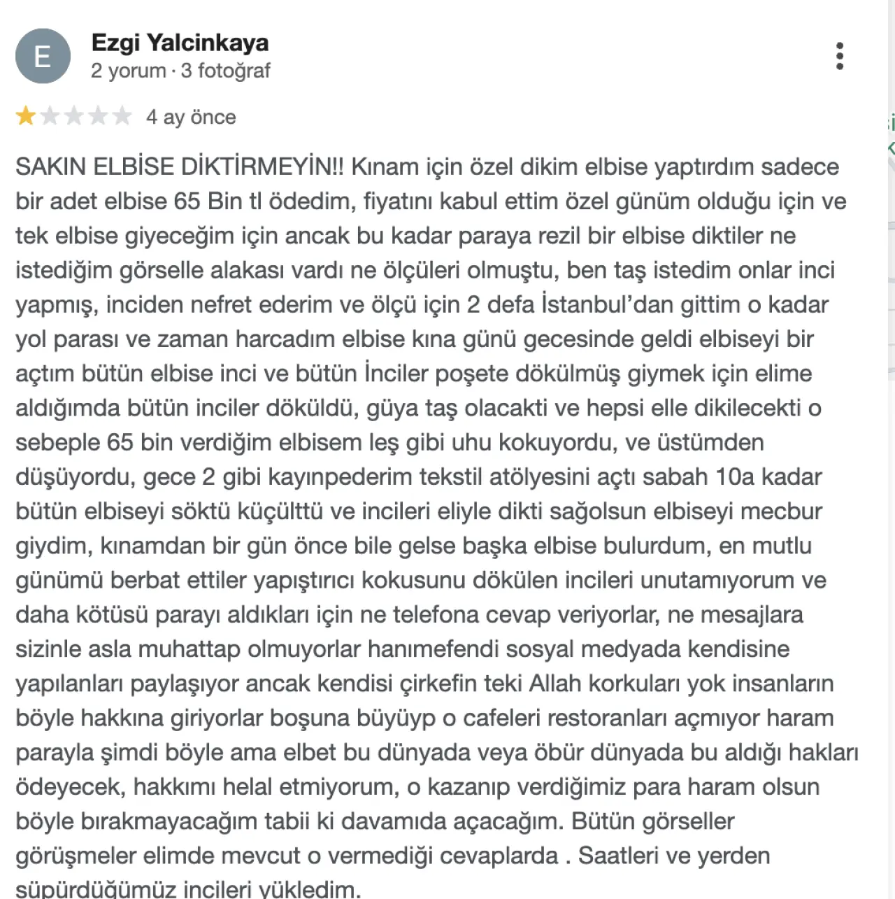Bir kullanıcı, özel günü için yüksek bir ücret ödeyerek dikim yaptırdığını ancak elbisenin hem model hem de işçilik açısından beklentisini karşılamadığını iddia etti. Benzer şekilde farklı yorumlarda da “istenen görselle alakası olmayan ürün teslimi” vurgulanıyor.
