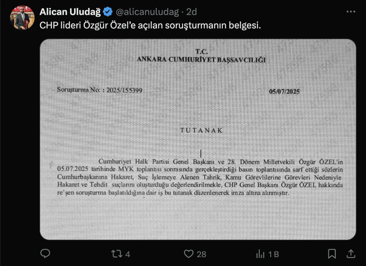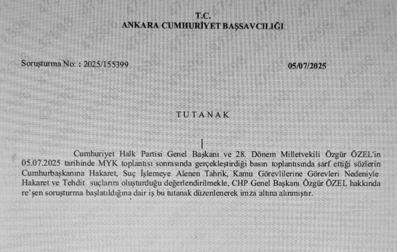 Ankara Cumhuriyet Başsavcılığı, CHP Genel Başkanı ve 28. Dönem Milletvekili Özgür Özel hakkında re’sen soruşturma başlattı. Soruşturmanın gerekçesi, 5 Temmuz 2025 tarihinde MYK toplantısı sonrasında düzenlenen basın toplantısında sarf edilen sözler.