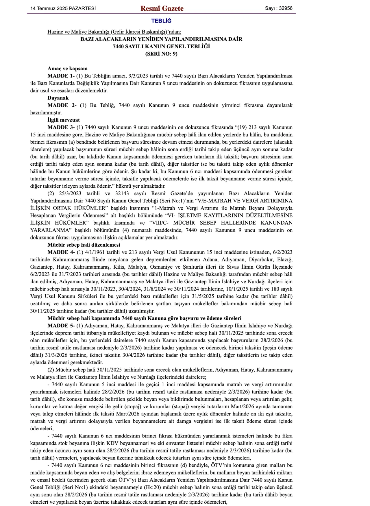 Hazine ve Maliye Bakanlığı tarafından yayımlanan 7440 Sayılı Kanun Genel Tebliği (Seri No: 9) ile, 6 Şubat 2023 tarihli Kahramanmaraş merkezli depremler nedeniyle mücbir sebep hali ilan edilen bazı illerde vergi borcu yapılandırması için başvuru ve ödeme süreleri yeniden düzenlendi.