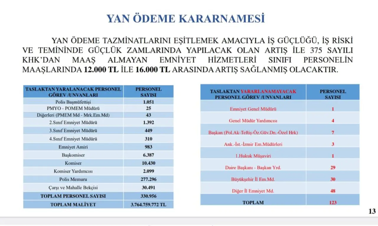 İçişleri Bakanlığı tarafından hazırlanan yeni Yan Ödeme Kararnamesi ile, iş gücünün ağırlığı, risk faktörleri ve görev zorlukları göz önünde bulundurularak 375 sayılı KHK’dan maaş almayan Emniyet Hizmetleri Sınıfı personeline yönelik önemli bir maaş iyileştirmesi hayata geçiriliyor. Kararnameyle birlikte, söz konusu personele 12.000 TL ile 16.000 TL arasında değişen oranlarda maaş artışı sağlanacak.