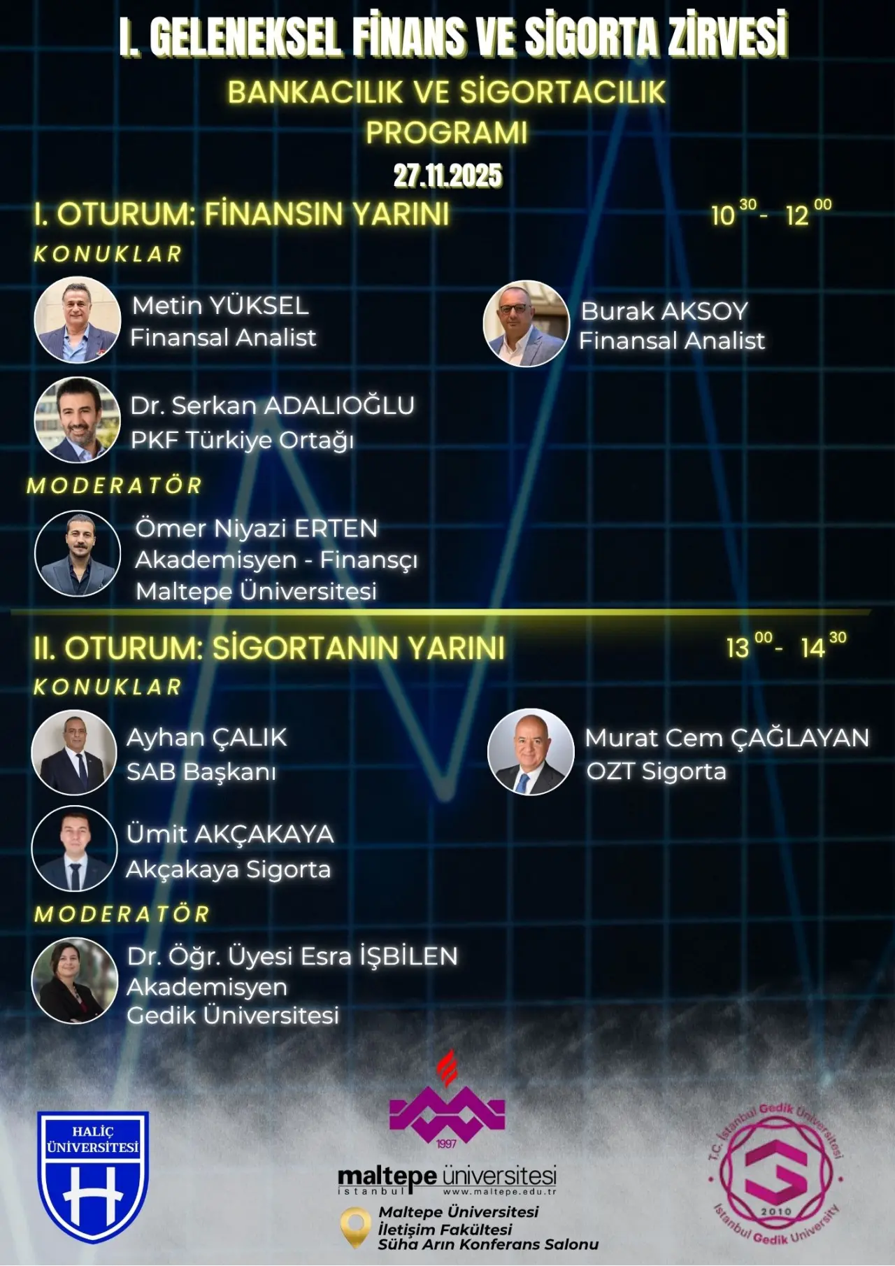 İstanbul – Maltepe Üniversitesi Bankacılık ve Sigortacılık Programı ev sahipliğinde, Gedik Üniversitesi ve Haliç Üniversitesi iş birliğiyle düzenlenen "I. Geleneksel Finans ve Sigorta Zirvesi", 27 Kasım 2025 tarihinde sektör profesyonellerini bir araya getirecek. Maltepe Üniversitesi İletişim Fakültesi Sıha Arın Konferans Salonu’nda yapılacak zirve, finans ve sigorta dünyasının geleceğine ışık tutmayı hedefliyor.