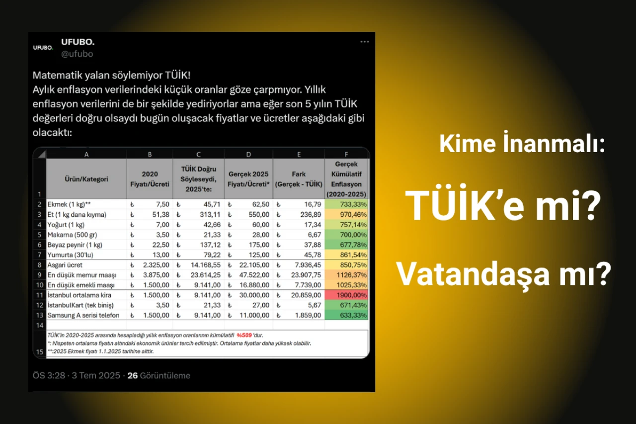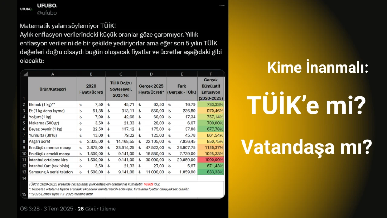 TÜİK'in açıkladığı enflasyon oranlarıyla vatandaşın mutfağındaki yangın arasında uçurum büyüyor. Son 5 yılın TÜİK verileri doğru olsaydı bugün fiyatlar nasıl olurdu? Sosyal medyada paylaşılan çarpıcı bir tablo, resmi verilerle gerçek hayat arasındaki farkı gözler önüne serdi.