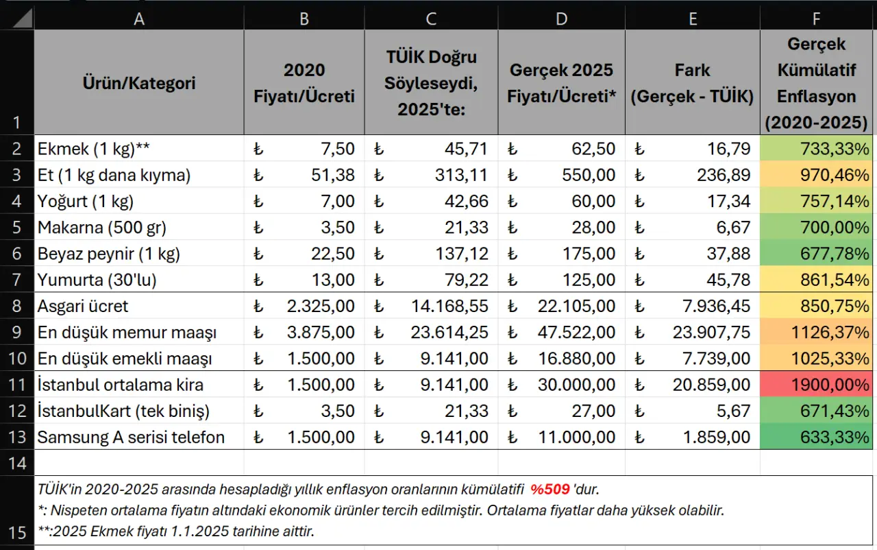 2020 ile 2025 yılları arasında TÜİK'in hesapladığı toplam enflasyon %509. Ancak market rafları, kira fiyatları ve ulaşım ücretleri bunun çok ötesinde. İşte birkaç çarpıcı örnek: