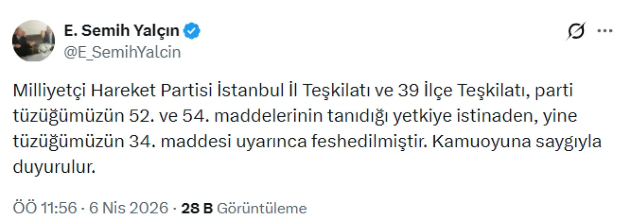 "Milliyetçi Hareket Partisi İstanbul İl Teşkilatı ve 39 İlçe Teşkilatı, parti tüzüğümüzün 52. ve 54. maddelerinin tanıdığı yetkiye istinaden, yine tüzüğümüzün 34. maddesi uyarınca feshedilmiştir. Kamuoyuna saygıyla duyurulur."
