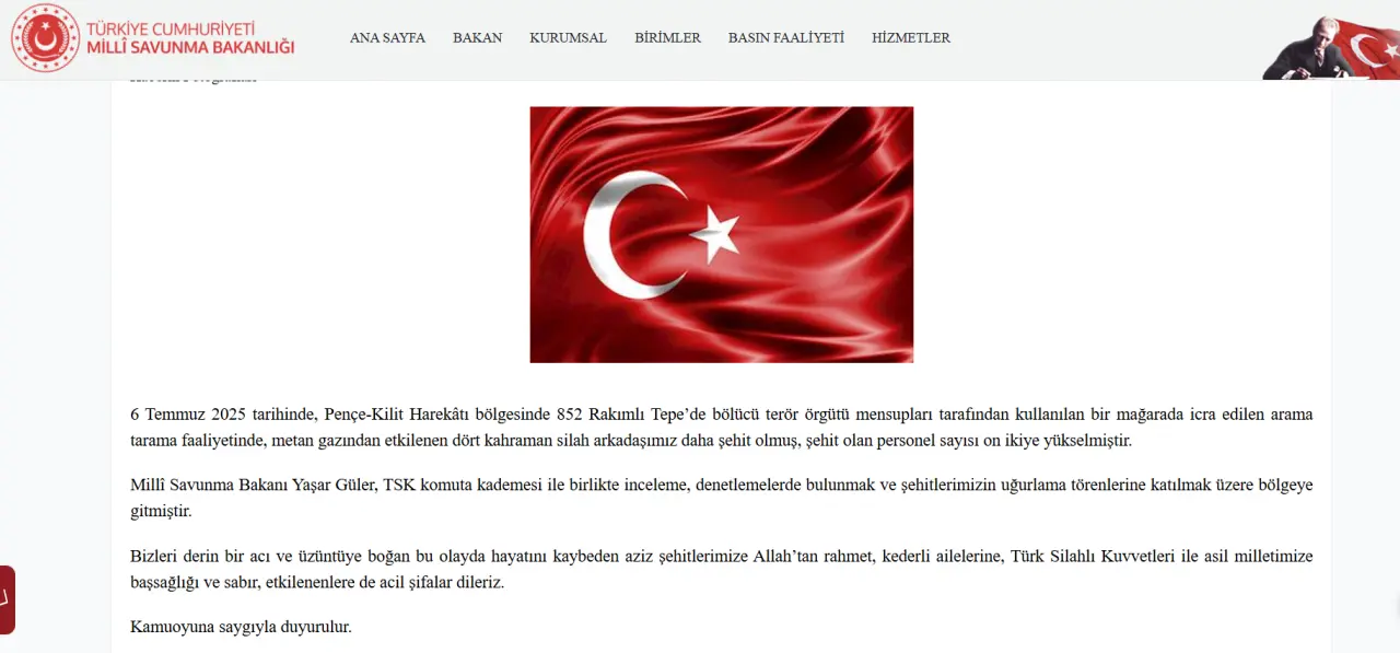 Bakanlıktan yapılan açıklamaya göre, 6 Temmuz 2025 tarihinde Pençe-Kilit Harekâtı bölgesinde 852 Rakımlı Tepe’de gerçekleştirilen arama tarama faaliyetinde, metan gazından etkilenen dört askerimiz daha şehit oldu. Bu durum, şehit sayısını on ikiye yükseltti.