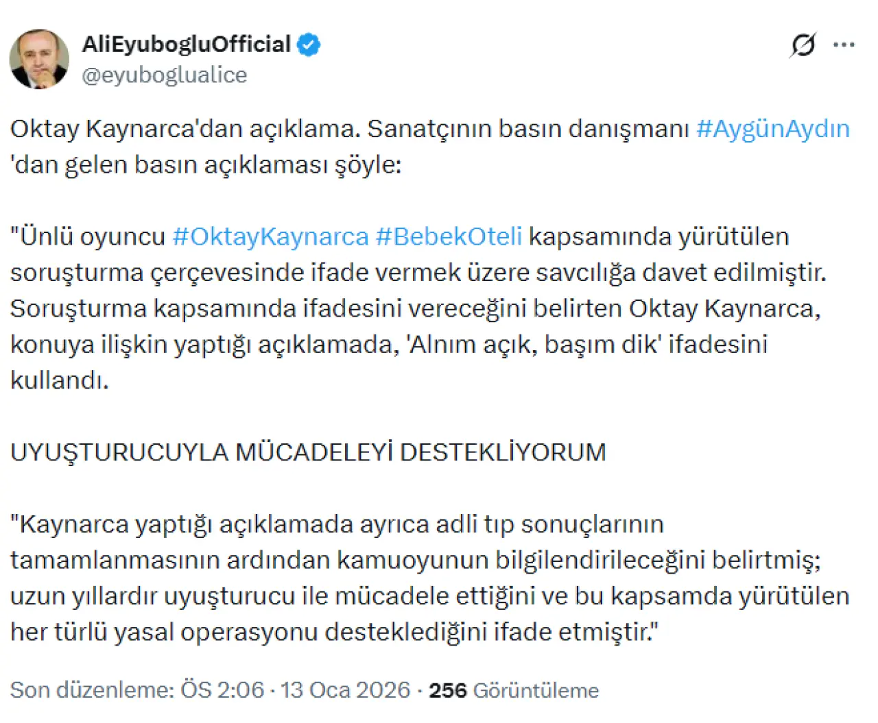 "Alnım açık, başım dik. Yıllarca uyuşturucu ile mücadele ettim. Adli tıp sonuçlarının tamamlanmasının ardından kamuoyu daha net bilgilendirilecektir. Bu kapsamda yürütülen her türlü yasal operasyonu destekliyorum."