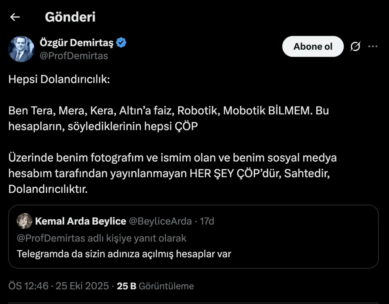 Son dönemde sosyal medya platformlarında, yatırım tavsiyesi adı altında sahte Özgür Demirtaş hesapları türemiş durumda. Bu hesaplar, yatırımcılara “yüksek kazanç” vaadiyle yönlendirme yaparken, kullanıcıların güvenini kötüye kullanıyor. Demirtaş ise bu tür içeriklerle hiçbir ilgisinin olmadığını, takipçilerini yalnızca resmî hesapları üzerinden bilgilendirdiğini vurguladı.
