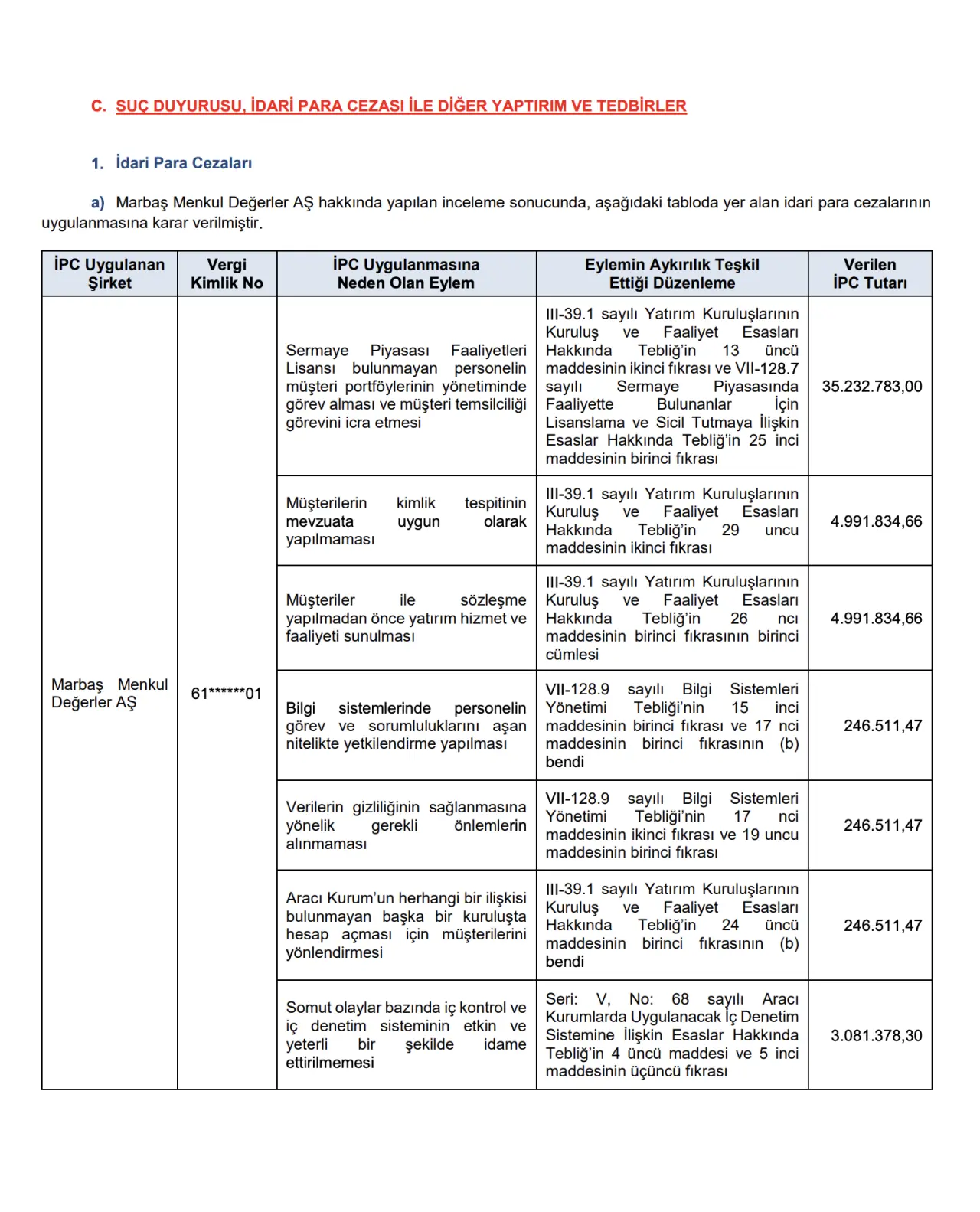 Karar kapsamında Marbaş Menkul Değerler AŞ’ye, tespit edilen her bir aykırılık için ayrı ayrı olmak üzere toplamda yaklaşık 49 milyon TL tutarında idari para cezası uygulanmasına hükmedildi.