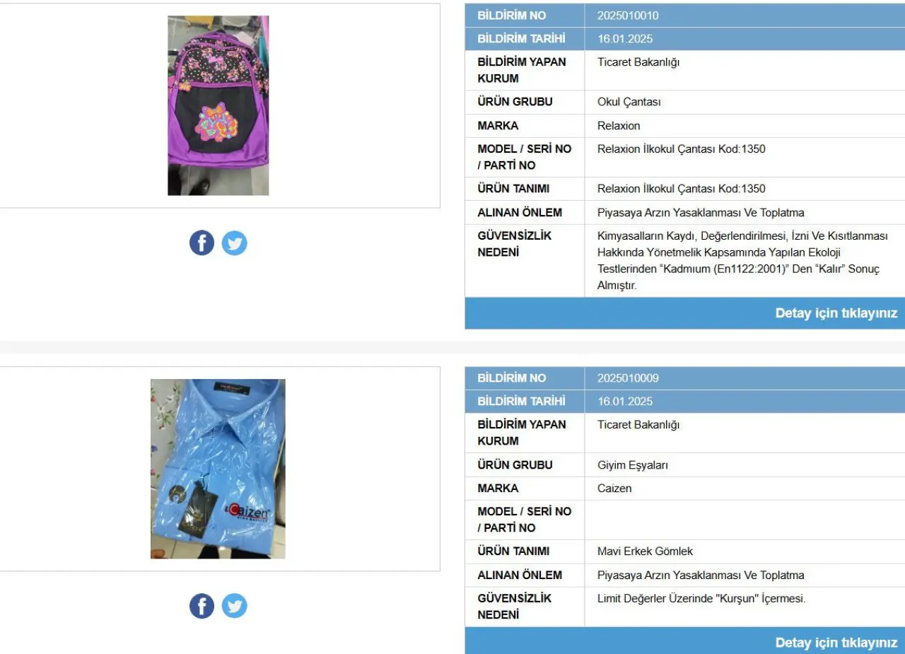 Gömleklerin yanı sıra, okul çantaları ve makyaj çantalarında da tehlike ortaya çıktı. Bir markanın ilkokul çantasının zararlı kimyasallar içerdiği ve belirlenen sınırların çok üzerinde kimyasal madde barındırdığı için toplatılacağı bildirildi. Ayrıca, bir makyaj çantasında kadmiyum oranının yüksek olduğu ve bu sebeple ürünün satışının durdurulacağı açıklandı.