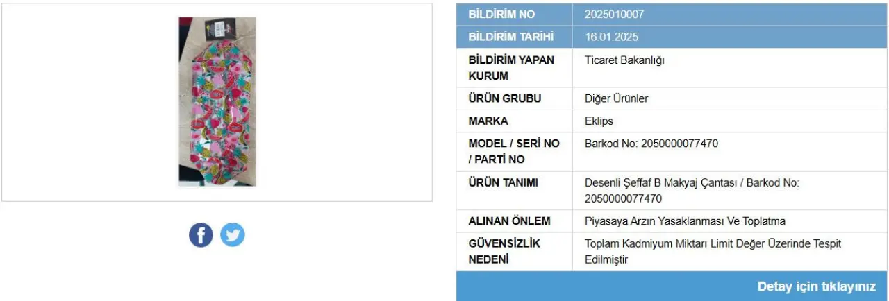 Ticaret Bakanlığı'ndan dikkat çeken bir açıklama geldi: Piyasada güvensiz olduğu tespit edilen yeni ürünler ifşa edildi. Bakanlık, Güvensiz Ürün Bilgi Sistemi aracılığıyla, bazı ürünlerde insan sağlığını tehdit eden maddelere rastlandığını duyurdu. Bu ürünlerin piyasadan toplatılmasına karar verildi.