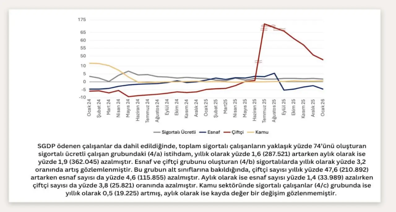 Sosyal Güvenlik Destek Primi ödenenleri de kapsayan toplam sigortalı çalışan sayısı Ocak 2026'da yıllık yüzde 1,6 artmış olsa da aylık bazda yüzde 1,6 azalarak 25 milyon 451 bin 620'ye geriledi. Son 6 aylık dönemde ise toplam istihdamda 1 milyon 57 bin kişilik düşüş yaşandı.