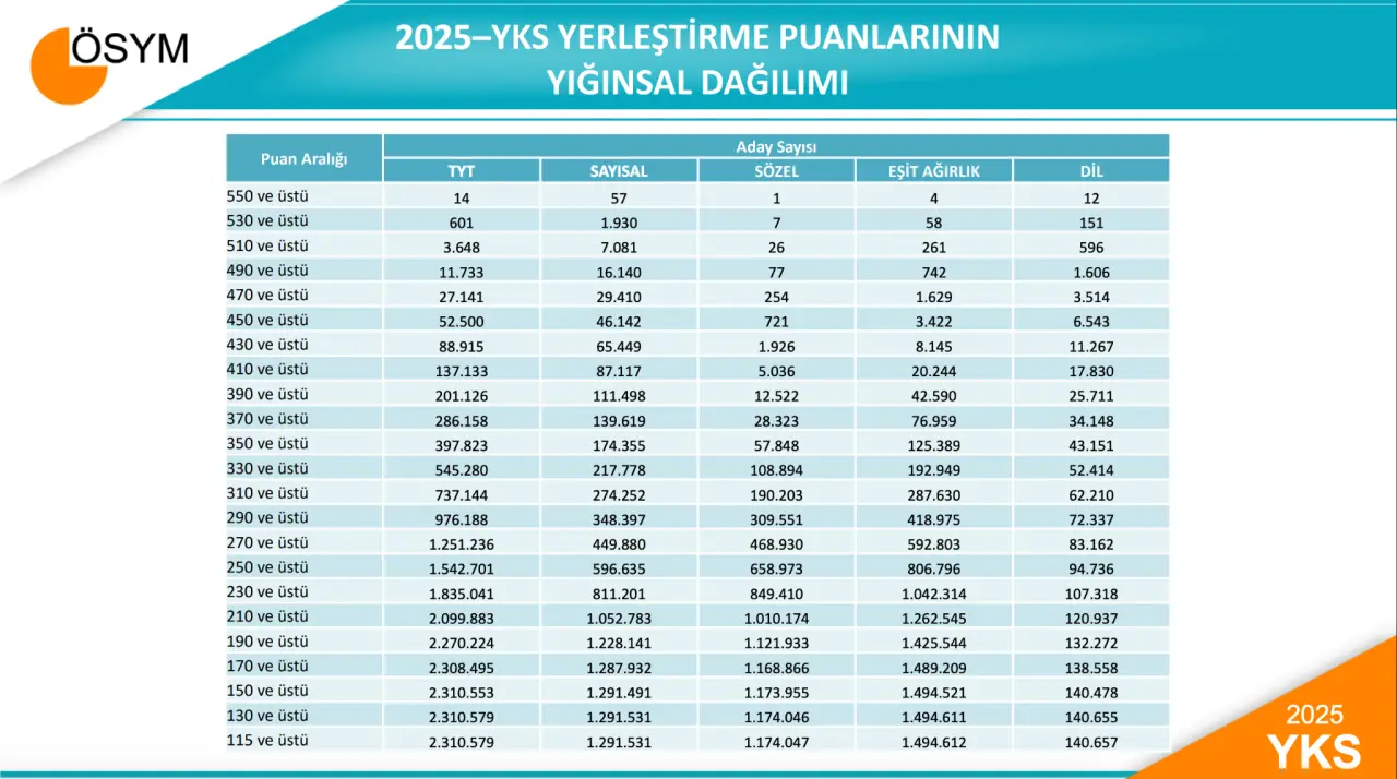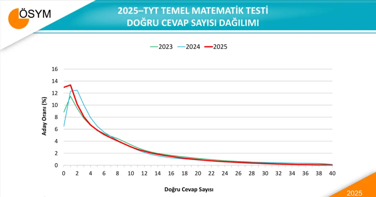 ÖSYM, 2025 YKS sonuçlarına ilişkin kapsamlı istatistikleri yayımladı. Aday sayıları, test ortalamaları ve puan dağılımlarını içeren tabloların yanında en dikkat çeken veri, TYT Temel Matematik doğru cevap dağılımı oldu.