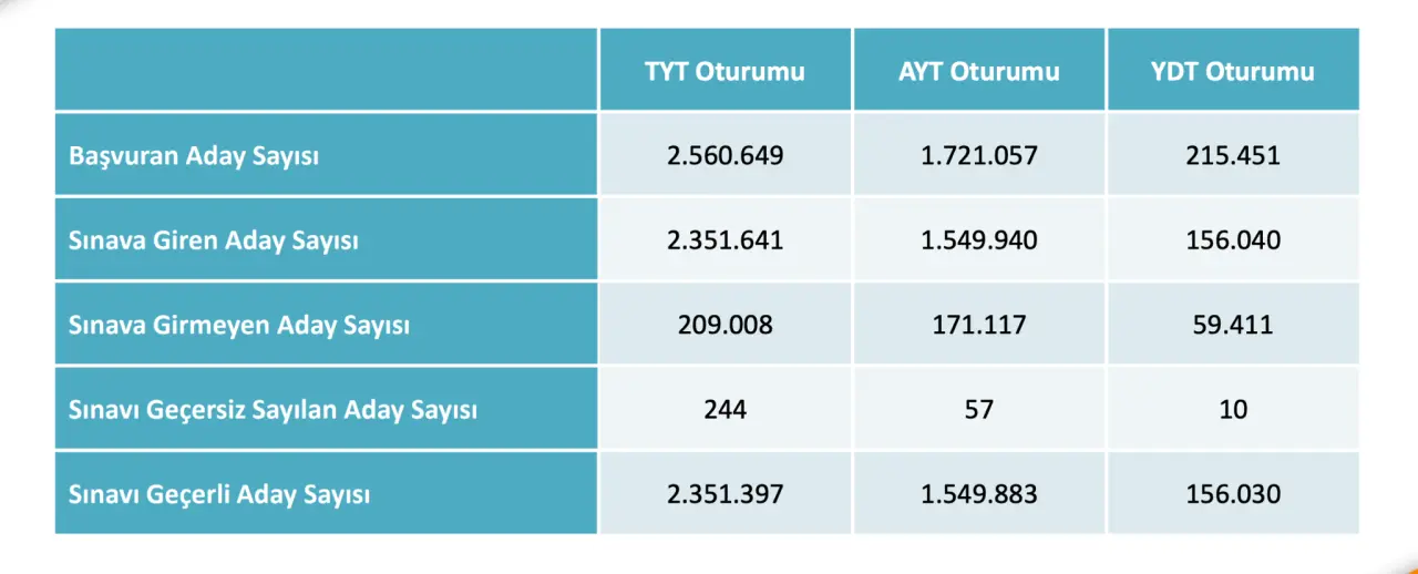 | Oturum | Başvuran | Giren | Geçersiz | Geçerli |