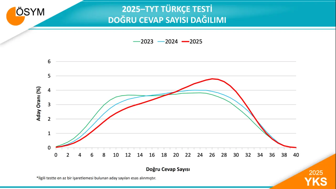 Türkçe grafiğinde 2025 yılı (kırmızı eğri), diğer yıllara göre önde seyretti. Adaylar, en azından okuduğunu anlamaya daha hakim görünüyor.