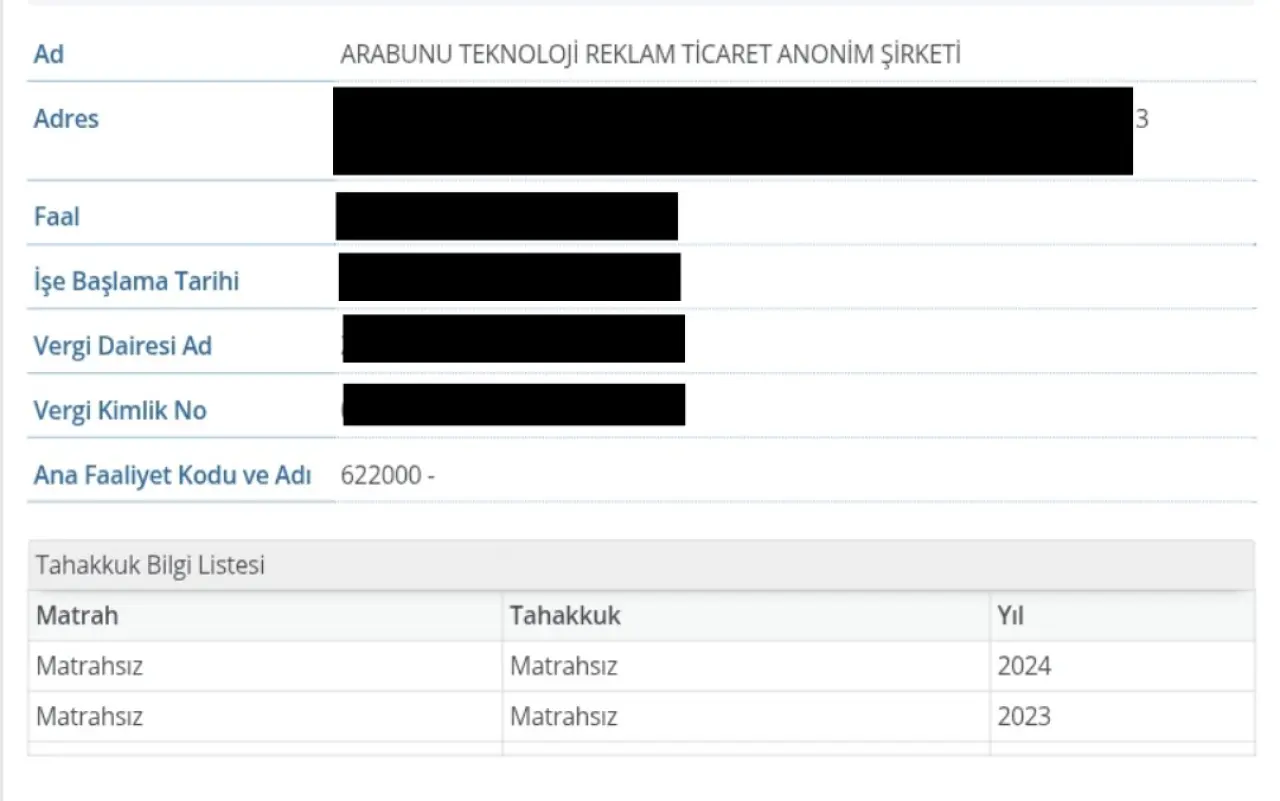 Vergi Dairesi kayıtlarına göre şirket, 2023 ve 2024 yıllarında "matrahsız" beyan vermiş; yani herhangi bir gelir üzerinden vergi tahakkuk ettirilmemiş. Faal görünen şirketin bu süreçte herhangi bir vergi yükümlülüğü yerine getirmemiş olması, sosyal medyada eleştiri konusu oldu.