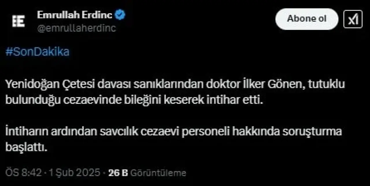 Yenidoğan Çetesi davası sanıklarından biri olan doktor İlker Gönen’in, tutuklu bulunduğu cezaevinde intihar ettiği bildirildi. Gazeteci Emrullah Erdinç, sosyal medya hesabından yaptığı paylaşımda, Gönen'in bileğini keserek hayatına son verdiğini duyurdu. Olay sonrası savcılık, cezaevi personeli hakkında soruşturma başlattı. Gönen, SGK’dan haksız kazanç elde etmek amacıyla yenidoğan bebeklere yanlış tedavi uygulayarak ölümlerine yol açmakla suçlanan ve davada yargılanan önemli isimlerden biriydi. Gönen'e yönelik suçlamalar arasında "kasten öldürme", "nitelikli dolandırıcılık", "örgüt kurma" ve "resmi belgede sahtecilik" gibi ciddi suçlar bulunuyordu. Hakkında 177 yıldan 582 yıl hapis cezası talep ediliyordu