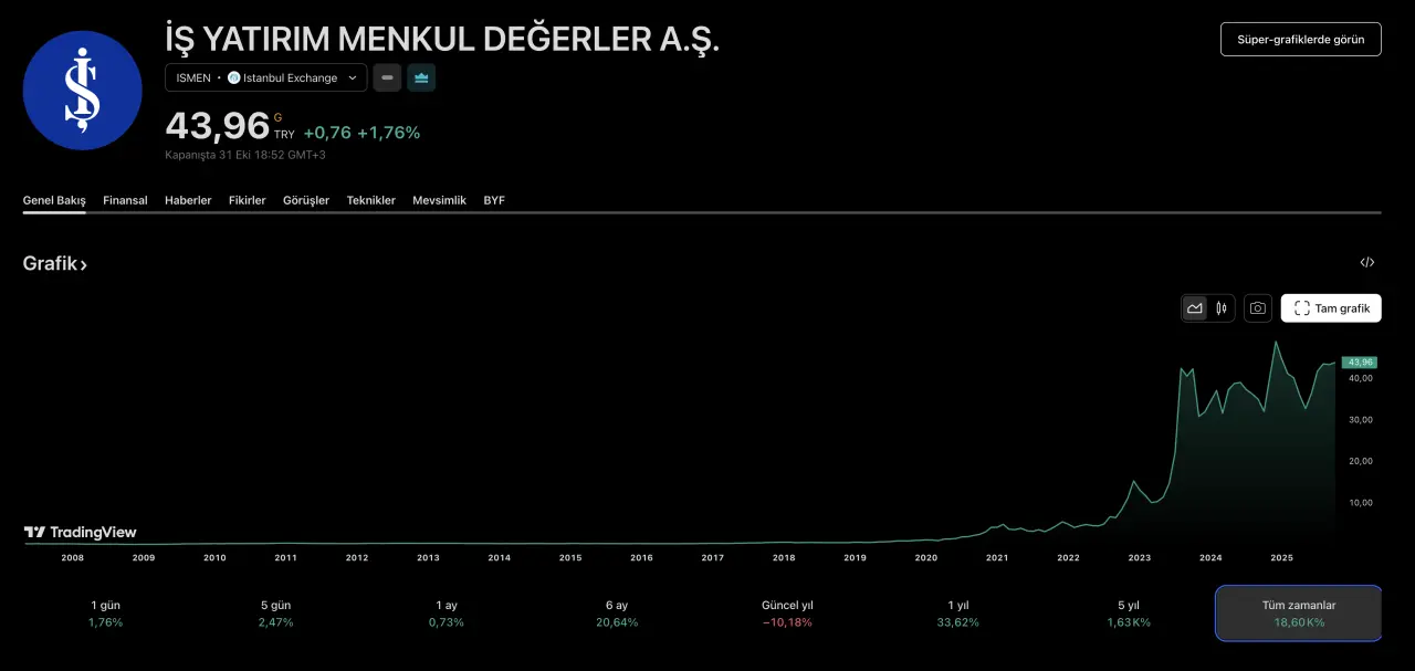 Borsa İstanbul son yıllarda birçok hikâyeye sahne oldu, ancak İş Yatırım Menkul Değerler A.Ş. (ISMEN) hissesi kadar istikrarlı ve çarpıcı bir performans sergileyen çok az hisse oldu. 2019 yılında bu hisseye yatırım yapanlar, sabrın ve temettü gücünün nasıl büyük bir servete dönüşebileceğini birebir gördü. O dönem 50 bin TL yatıran bir yatırımcı, bugün yaklaşık 6 milyon 250 bin TL’lik bir portföy değerine sahip durumda.