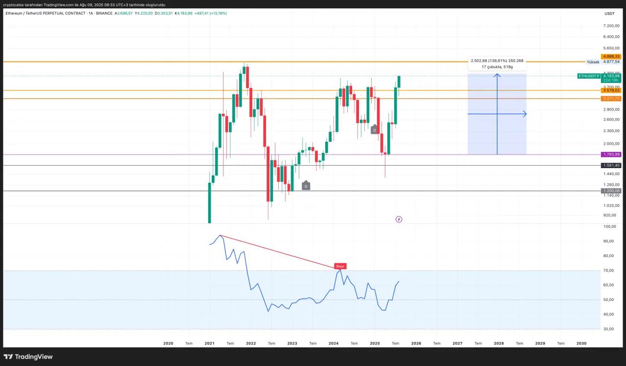 Kripto piyasalarının en büyük ikinci varlığı olan Ethereum (ETH), 2025 yılına damga vuran yükseliş trendini hız kesmeden sürdürüyor. Nisan ayında belirlenen 3.270 – 3.579 – 3.880 dolar hedefleri, Ağustos ayı itibarıyla tek tek geçildi. Bugün itibarıyla 4.180 dolar seviyesinde işlem gören ETH, grafiklerde “çanak formasyonu” olarak bilinen güçlü bir teknik oluşumu tamamlamaya çok yakın. Eğer bu formasyon hedefi çalışırsa, yıl sonuna kadar 10.000 dolar seviyeleri artık uzak bir ihtimal olmaktan çıkabilir.