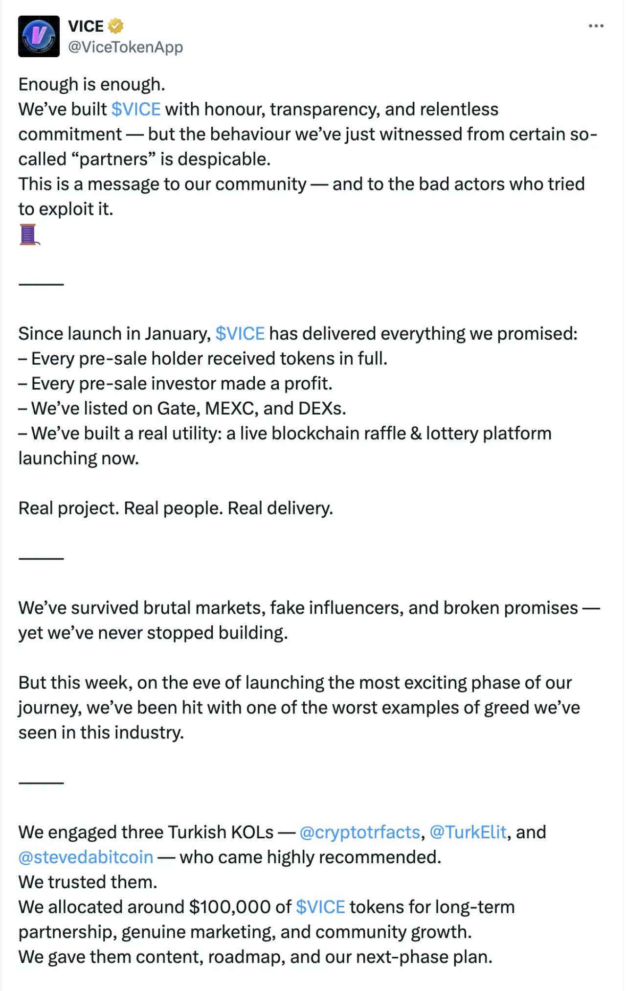 Kripto projesi $VICE, sosyal medya hesabından yaptığı sert açıklamayla üç Türk kripto fenomenini hedef aldı. Ekip, @cryptotrfacts, @TurkElit ve @stevedabitcoin adlı fenomenlerin, proje ile yapılan iş birliği anlaşması kapsamında aldıkları yaklaşık 100.000 dolar değerindeki $VICE tokenlarını, henüz tek bir paylaşım yapmadan Gate ve MEXC borsalarına aktararak satışa başladıklarını iddia etti.