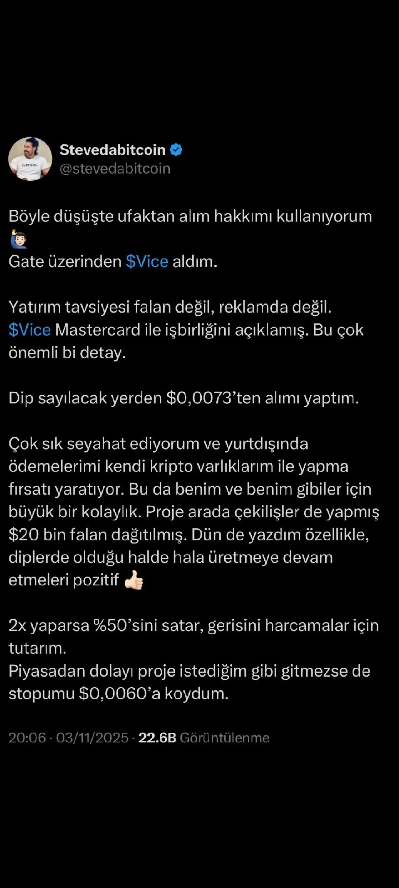 Kullanıcı, $Vice projesinin Mastercard iş birliğini öne çıkarıyor, fiyat seviyelerini ($0.0073 alım, $0.0060 stop) belirtiyor ve “hala üretmeye devam etmeleri pozitif” diyerek alım yönlü bir algı oluşturuyor.