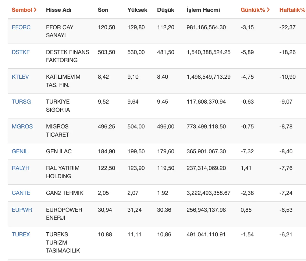 Haftanın en sert düşüşü, yüzde 22,37 değer kaybeden Efor Çay Sanayi (EFORC)’te yaşandı. Bu düşüş, 500 bin TL yatırım yapan bir yatırımcının portföyünde 111 bin 850 TL’lik erimeye yol açtı. İkinci sırada yer alan Destek Finans Faktoring (DSTKF) yüzde 18,26 gerileyerek aynı yatırım tutarında 91 bin 300 TL zarara neden oldu. Üçüncü sıradaki Katılımevim Tasarruf Finansman (KTLEV) ise haftayı yüzde 10,90 kayıpla kapatarak yatırımcısına 54 bin 500 TL kaybettirdi.
