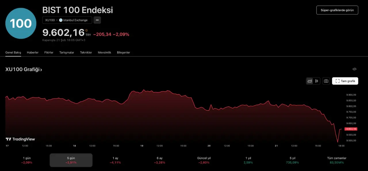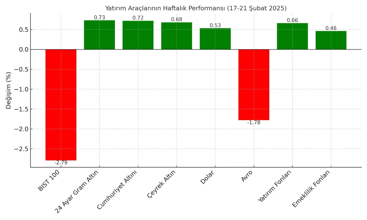 Yatırım araçlarının haftalık performansı açıklandı. BIST 100 endeksi, bu hağfta en düşük 9.474,03 puanı gördükten sonra haftayı, önceki hafta kapanışının yüzde 2,79 altında 9.602,16 puandan tamamladı.