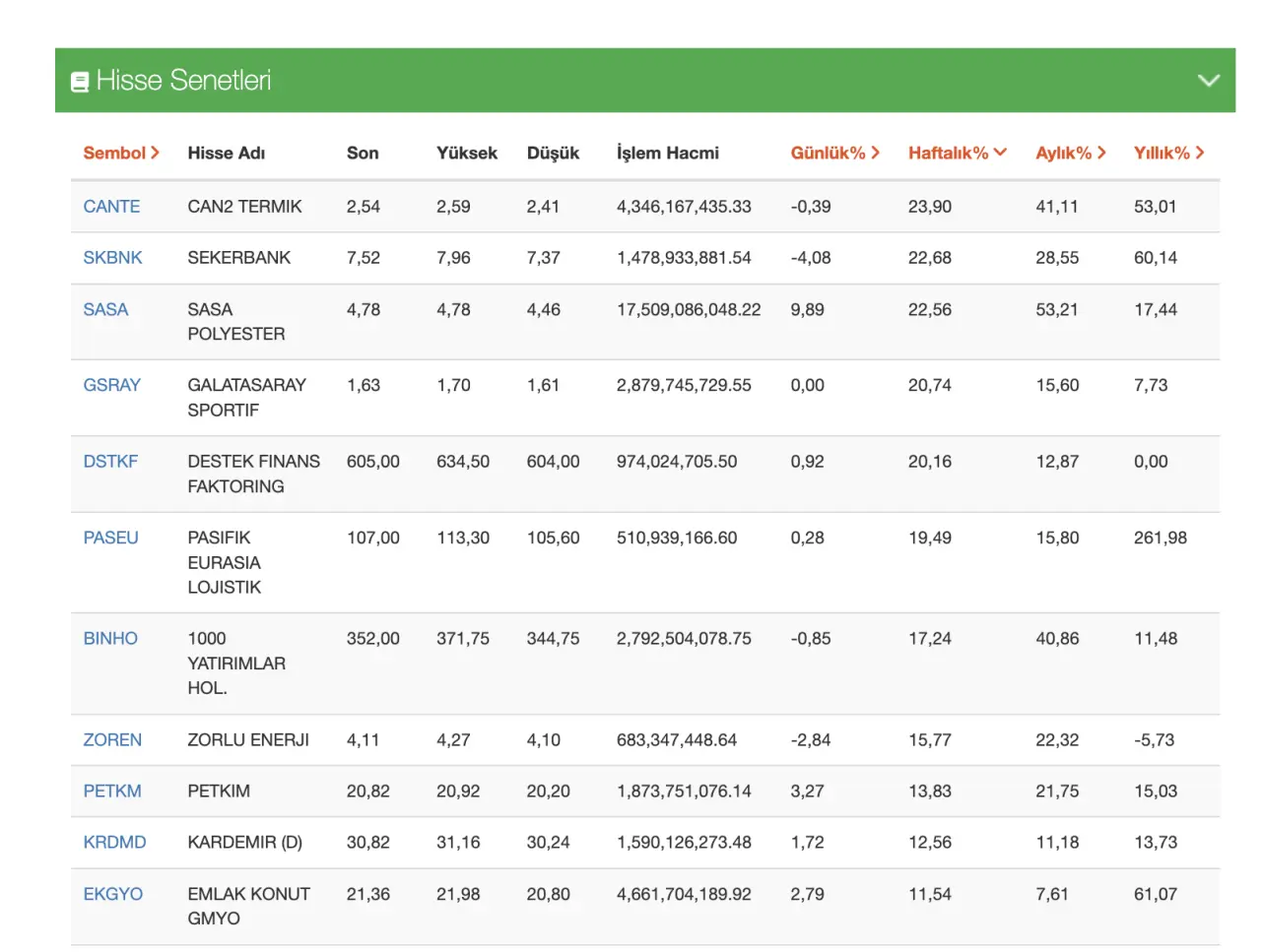Ağustos’un üçüncü haftasında Borsa İstanbul’da yükseliş eğilimi, özellikle enerji, banka ve kimya sektörlerinde yoğunlaştı. Yatırımcıların ilgisini çeken hisseler arasında yüksek işlem hacimleriyle SASA ve CANTE ön plana çıkarken, spor ve faktoring hisselerinde de güçlü bir ralli izlendi.